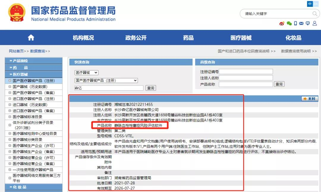 获批静脉血栓栓塞症(VTE)风险评估软件医疗器械注册证
